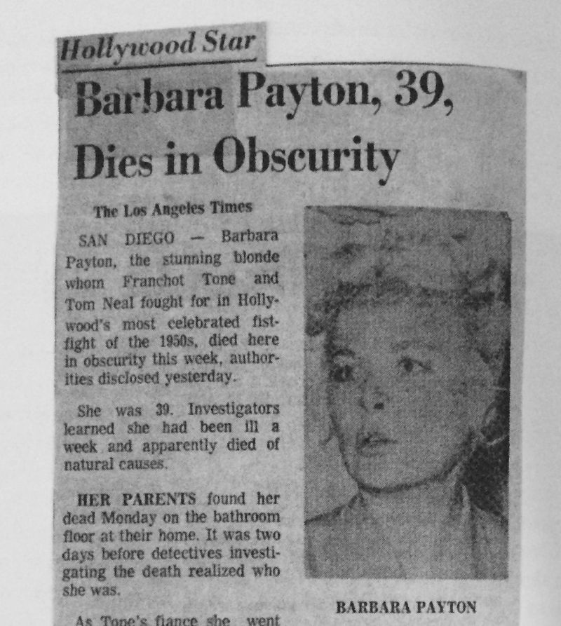 The judgment of her seems especially harsh, twisting her beauty into continual ugliness and the (gasp!) horror of growing old and not just blousy, bloated. The way people viewed Payton (though some friends felt for her) is with the underlying sense of “she deserves it.” Well. Franchot Tone can mess up his life and relationships three times over, but once Barbara took up with Detour actor Tom Neal after marriage to Tone (Neal almost killed Tone in a beat down that was the scandal of Hollywood – something you can’t even imagine today, and Neal is another story…) the often powerful, charismatic actress (she really had it on screen – even up to her last film, Edgar G. Ulmer’s Murder is My Beat) was done for.