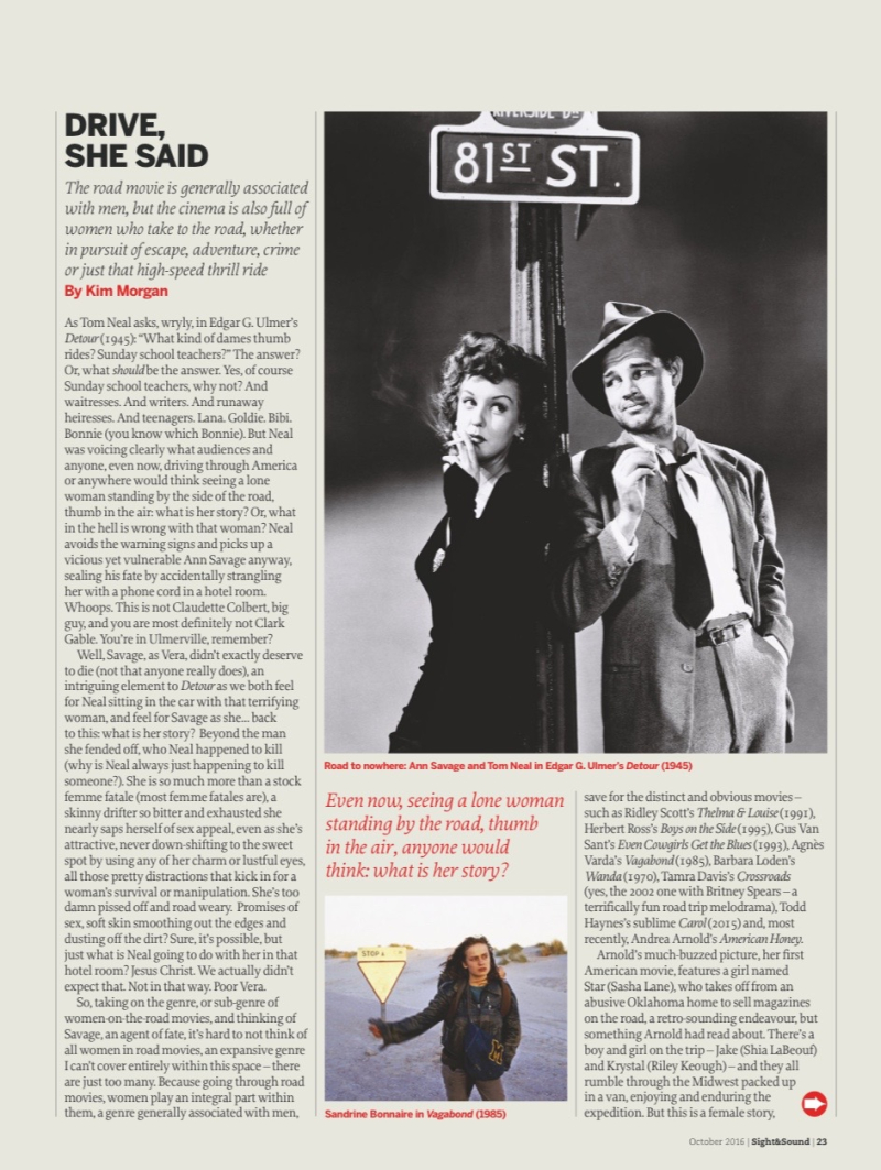 The October edition of Sight & Sound is out and I've written an essay on something near and dear to me — the road, cars, and especially women on the road. Pick up the magazine on newsstands, soon. Here's an excerpt: