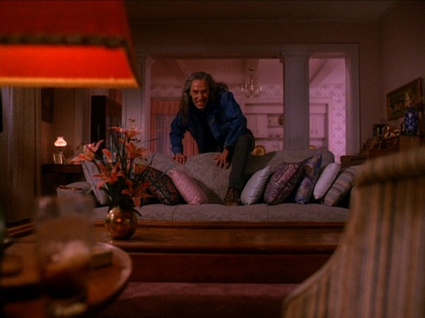 The melodrama is pitched to, not realism, for what does realism mean anyway? But to dark melodrama bursting from the night air, as if it’s been trapped in the town and in Leland Palmer’s smile all these years. No wonder he wails “Somebody dance with me!” Give him a reason to smile. And be crazy. And sing “Mairzy Doats” for no reason other than, that’s just the right song to sing when you’re losing your mind. It’s funny. But it’s troubling and despondent.