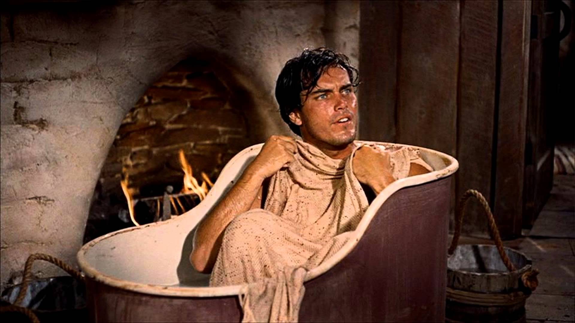 Laurie also seems more sexually obsessed with Martin than in love — she can’t keep her hands off of him and delights seeing him naked while he’s demanding privacy during a bath. She’s sexually aggressive to the point of obnoxiousness. There’s nothing wrong with that and who can blame her? She’s lonely out there and it is Jeffrey Hunter after all (who shows up looking like that?) but it’s intriguing just how much Martin is objectified in the movie, much more than the women. Often shirtless, soaking in the bath shielding his body like a bashful woman, rolling around in blankets, or just ridiculously gorgeous, those blue eyes burning a hole through Ford’s lyrical, magnificent frames, Hunter’s beauty occasionally makes you gasp. It’s also a source of Ford’s humor, particularly his romantic mishaps (and the entire wedding sequence that goes haywire), but also underscores his difference from others. When first introduced, Martin, all sprightly and smiling, is riding Indian style – bareback.