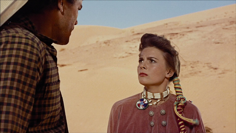 He’s right. The movie is uncomfortable, but not solely because of Ethan, it’s uncomfortable for Debbie and for Martin as well. Because walking through that famous door is teenager, now-a-woman Debbie (Natalie Wood), tentative, traumatized, the widow and “polluted” white woman of the slain Comanche, Scar (Henry Brandon), and her adopted brother, Martin Pawley (Jeffrey Hunter), the part Cherokee (one eighth) who spent all those years protecting Debbie from murderous Uncle Ethan while enduring his uncle’s humiliations and racist ridicule (“Blanket head”) and Vera Miles’s hyperactive horniness (which isn’t so terrible, though she’s not exactly a likable character).