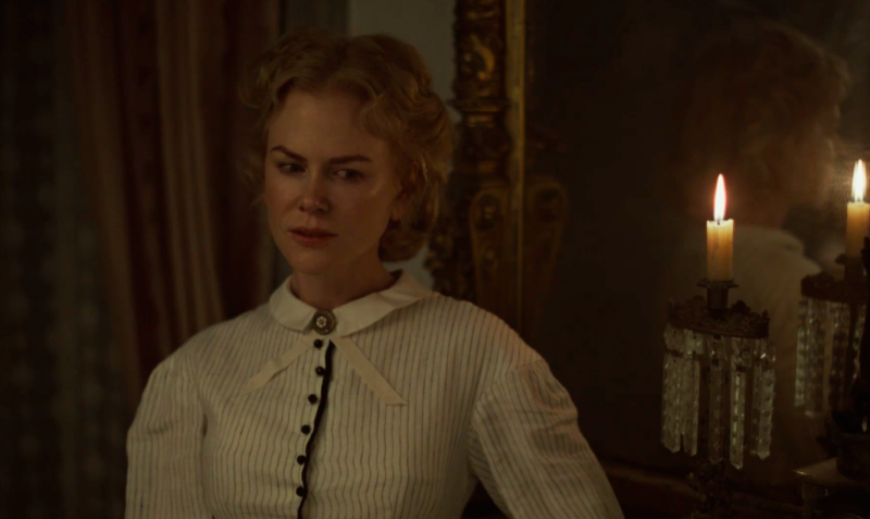 With the approval of the strict, intelligent and subtly scary matriarch (scary, so far, in that she is the one who wields all of the power), Miss Martha Farnsworth (Nicole Kidman), McBurney is dragged in and tended to. His arrival is reasoned as the good Christian thing to do, but we already sense other motivations, one being the curiosity and excitement of this exceedingly handsome, clearly charismatic intruder/guest. Martha sews his wound (it’s a strangely lovely scene – matter of fact more than maternal) and in one of the film’s most erotic moments, she carefully bathes him while he lies in bed at her mercy. Watching Martha rub down his chest and nearing his pelvis, her usual flintiness now clouded with allowed intimacy and the thrilling act of looking at this man’s body (something she’s not done in quite some time) is intriguing – Kidman’s inner emotions are not only sexy but oddly tense and fascinating to observe. They’re even a little sad. She must repress.
