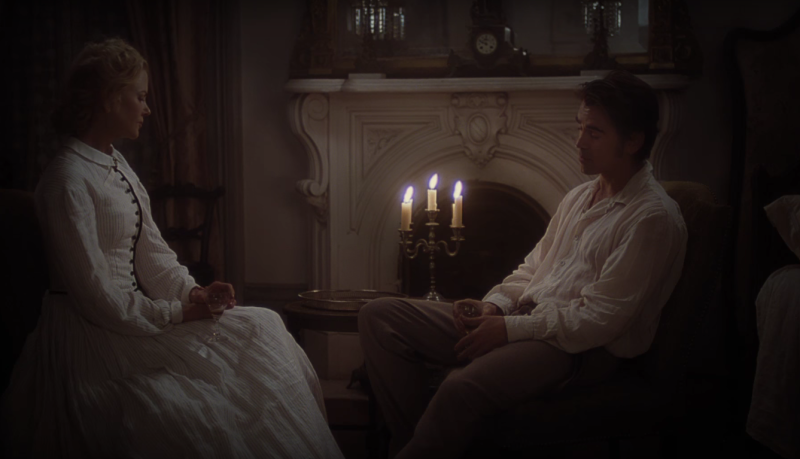 Once McBurney is sitting at candlelight dinners with the females dressed so fetchingly, watching their recitals and with his leg healing nicely, helping out on the grounds, the women begin to compete more openly (there’s a humorous scene about all of those involved with the creation of a pie he likes – and making sure McBurney knows who contributed what to that pie). Farrell sits pleased as the charming, delighted wolf – he knows he’s got them under his spell – and is able to start playing them. This is also when things begin to get extra-thorny and sinister, for all involved. Shot with a gossamer beauty (by Philippe Le Sourd), where warm, candlelit interiors are picturesque and slightly scary; where the outside world has a smoky, gauzy pastoral beauty but feels dangerous (it is dangerous), The Beguiled is positioned inside an alternate universe that’s not too far removed from the reality of the time. From the women’s dresses, to the moss on the trees, to Farrell’s wounds, these are photographed with totemic import – these things mean something to all involved.