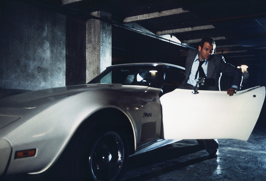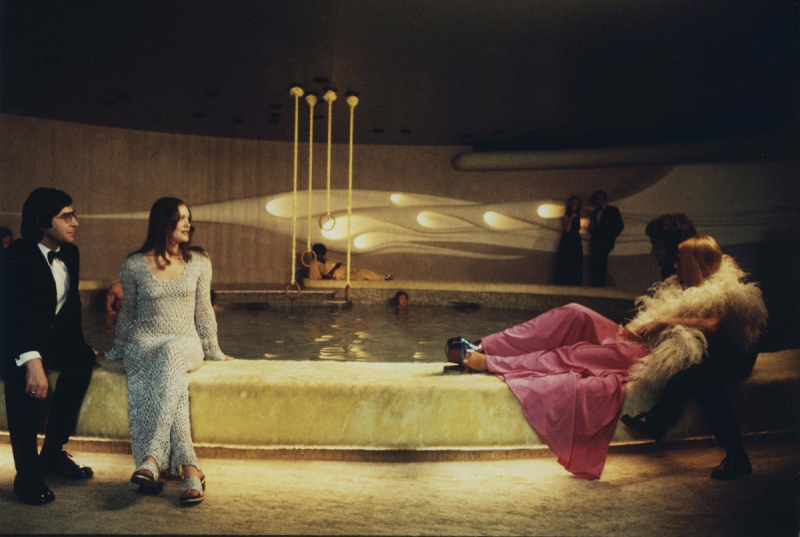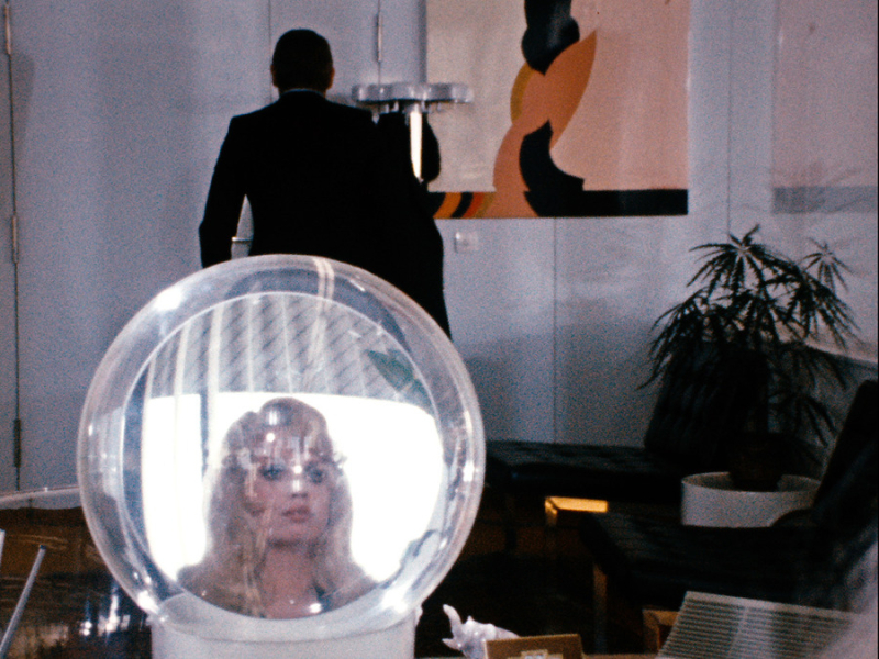 And, again, style. This picture is mad with style – as chic as Petra von Kant’s designs and her artfully crafted bedroom/set, it often looks like a work of installation art, in which characters at pool parties stand like mannequins or float like ghosts, shimmering blue water lighting faces, gleaming plastic surfaces, white statuary adorning 70s sci-fi/mid century modern rooms with pops of color from telephones, TV screens looking back at us, and of course, mirrors everywhere, sometimes as many as three or more in one shot. Women traipse around sexily, listlessly in gowns for day attire, men don fedoras and sharply tailored suits, our hero drives a white corvette, looking more like a noir hero or a suave super spy than his job title – technical director of the Institute for Cybernetics and Futurology.