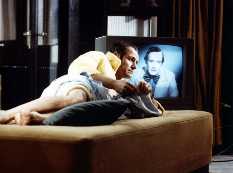 That Fassbinder was exploring the virtual world, and before The Matrix, Blade Runner, Tron, Videodrome, eXistenZ and other later pictures (Philip K. Dick was writing about these ideas early on) is another fascinating corner of the young, absurdly prolific genius’s mind. His interests and imagination were boundless (I’m not going to list all of the films he made before dying at age 37, but there were 40 features, not counting TV, shorts and plays) and so the idea of looking at reality through an alternate reality likely merged with the filmmaking process itself. Fassbinder was 27 when he made this series, and in a year that would produce three other works: Nina Helmer, Martha and Ali: Fear Eats the Soul. He assembled many of his recurring actors: Löwitsch, Barbara Valenin, Raab, Margit Carstensen, Ulli Lommel, etc., mixed with older German actors and interesting cameos – one from Rainer Langhans, which struck me as curious. Famous for being a member of Kommune 1, Langhans is almost known in rock lore for dosing Fleetwood Mac’s Peter Green during an infamous Munich trip that would reportedly warp Green’s mind and send him into madness. That Fassbinder chose Peter Green’s popular, soothing beautifully trippy 1969 Fleetwood Mac instrumental “Albatross” to not only fade out the first and second part of the series but to also score Stiller fleeing in his car, seems a intriguing coincidence, or perhaps he knew the story (maybe Langhams told him about it – I feel like Fassbinder would know this particular detail).