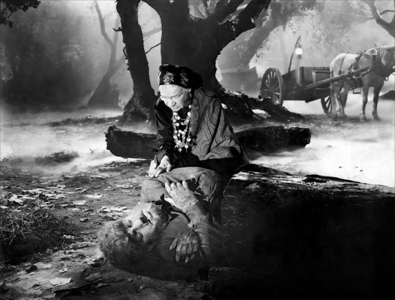Those themes of marked tragedy and duality are also carried over into the fascinating gypsy characters, fortune teller Maleva (Maria Ouspenskaya) and her son Bela (Bela Lugosi), who in so many ways merge with the family Talbot – Sir John and Maleva. Both have afflicted sons with dual natures they cannot control (and conditions that are not their fault), both have quite a few thoughts about it, and both sons will die. Sir John believes in science, god and psychology; he believes men can be so influenced by superstitious folklore, and that a normal individual can imagine himself so strongly that he thinks he’s becoming a monster. Maleva believes in the folklore, for she has seen it first-hand, but her acceptance and directness, and also the protection of her son (which leads to an attempt to protect Larry – as much as she can), mirrors Sir John. The toney Welsh family and the traveling gypsies are not too far removed – they are individuals and they are unique. They stick out. You get a sense many in the town suspects something about the Talbots in a negative way (cursed?), and in the gossipy townsfolk’s busy-body averageness, they talk about it. When Larry does in fact turn into the Wolf Man and wreaks havoc at night, some are quick to “know” – to know something; that they suspected murder within this family in the first place. And without proof. One woman sneers: “Very strange there were no murders before Larry Talbot arrived… I know what I know. You should have seen the way he looked at me in Conliffe’s shop. Like a wild animal. With murder in his eyes.”