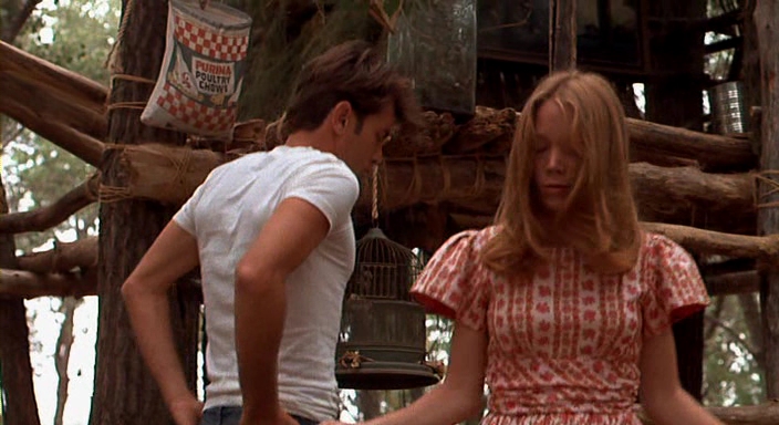 We don’t know how much of Holly’s sometimes florid recollections are a true representation of how she feels; about the brutal events on their crime spree. Though I do believe her reveries – I believe them in terms of how she wants to feel at the time, or how she wants to remember them at the time. But her romantic notions turn into tedium and annoyance towards Kit, even a wish he’d die. The rush of teen love is always dramatic, and so when Holly says: “In the stench and slime of the feedlot, he’d remember how I looked the night before, how I ran my hand through his hair and traced the outline of his lips with my fingertip. He wanted to die with me, and I dreamed of being lost forever in his arms.” You don’t doubt her. But you also watch their scenes together and observe them talk about banal things, like garbage on the street, or a tree falling in the water; Kit records a series of bromides on the Dictaphone when they take a break holed up in the rich man’s house they’re holding hostage. Holly seems joyful and attracted but sometimes, disappointed and irritated. When they finally have sex she asks: “Is that all there is to it? Gosh, what was everybody talking about?” Kit answers, “Don’t ask me.”