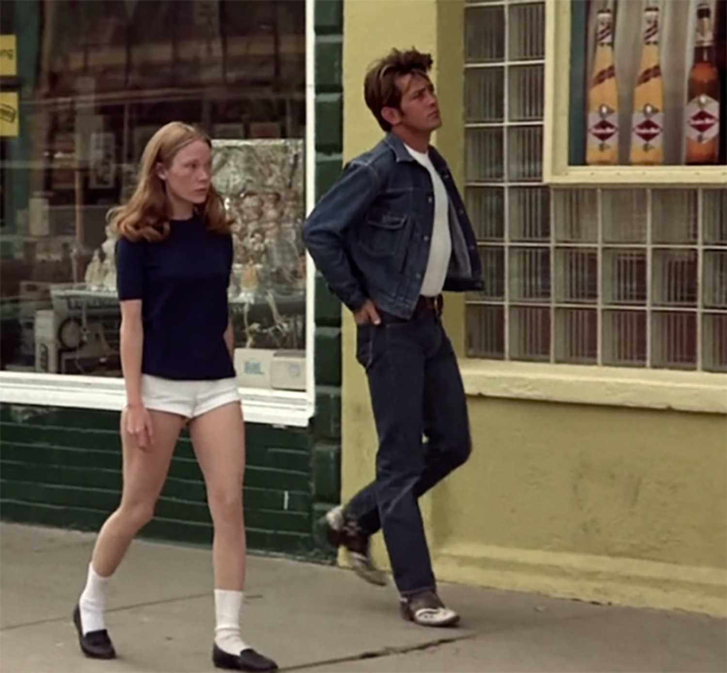 Part of Malick’s brilliance lies in the way the picture is narrated by Spacek’s little 15-year-old girl who, at times, seems both younger than her years and older – a girl who, from the outset, is estranged from her father (“He tried to act cheerful, but he could never be consoled by the little stranger he found in his house,” she narrates). Her dad (Oates, so weirdly beautiful here, both fearsome father and broken-hearted widower who kept his wedding cake in the freezer for ten years) forbids her to see the local bad boy, 25-year-old Kit, a garbage collector who is fired from his job and who puffs himself up in a world that doesn’t give a shit about him. He’s a cool young man, gorgeous in his 1950’s blue jeans, but he doesn’t seem to fool others with his big talk. He can fool a teenager, however. Holly recalls he “was handsomer than anybody I’d ever met. He looked just like James Dean.” That would be quite something for a shy girl who believes she lacks personality, a girl simply twirling her baton in those white shorts on the lawn. And then this boy comes along, changing her fate forever. She likes that he appreciates her mind, and not just sex.