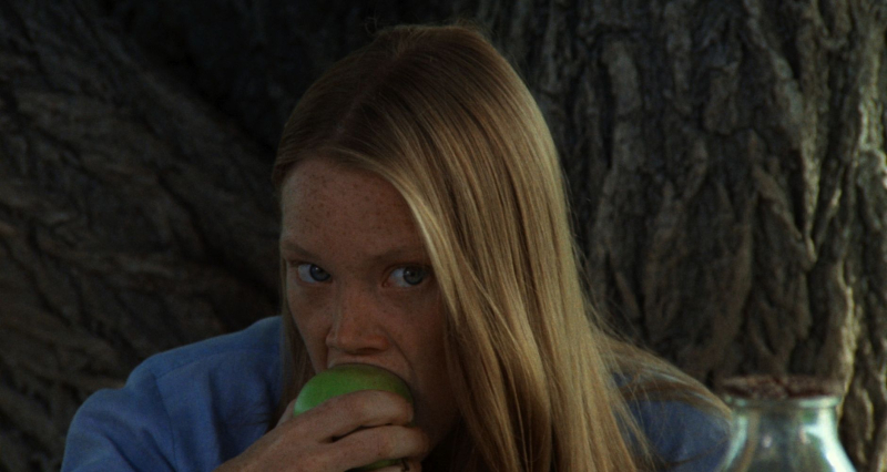 Creating an idyllic world is an escape from the junk of life; a need to transcend regular existence, so taking in the picture’s glory of nature, we feel like we could always escape day-to-day banalities if we tried. Holly observes nature, loving the “cooing of the doves and the hum of dragonflies… the air made it always seem lonesome and like everybody’s dead and gone.” Kit wants more; he’s searching for some fabled kingdom. As Holly narrates: “We took off at sunset, on a line toward the mountains of Saskatchewan, for Kit a magical land beyond the reach of the law.” That magical land is . . . where? It’s either everywhere, in moments, if you really appreciate nature, or, in Kit’s case, in his death, when he’ll be so mythologized that songs will be written and movies will be made about him. Malick understands this eternal desire. Not to be famous, but to be remembered, not to remain specks of dust in such an enormous world.
