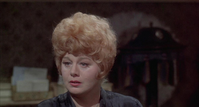 ”Metaphysical. I’m not sure he felt this strongly about Shelley Winters – she was never Joan Crawford – but he understood Winters’ power and star quality and unique neediness. And he understood her pathos. As Roo holds a séance conducted by fake psychic Mr. Benton (a great Ralph Richardson) with Auntie Roo’s shifty, psychopathic butler Albie (a creepy Michael Gothard) included – they have been tricking her – and you hate them for it. You don’t laugh at her, you realize what awful people are exploiting her. One of the servants, Clarine (Judy Cornwall), is providing the ghostly voice of Roo’s dead daughter, making Roo hold on to hope even more, and Benton to rake in even more dough, that bastard. They’re so unscrupulous, such scumbags, that they don’t feel a thing when a beseeching Roo hollers out for her child: “Oh, Katharine stay! Stay my darling. Please forgive me! Forgive me! Give me another chance! I love you so much! Oh, Katherine! I need you, stay with me! I’m so lonely, stay with… Katherine!!”