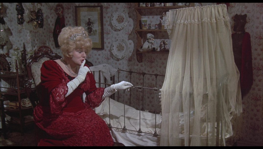 There doesn’t seem to be any suitors for Rosie nor does she appear to want one. No man will steal her time. Oh, but the right child – that is different. And it’s not like the world wants Rosie in that way anymore, which is a shame (she’s often fabulous), but the world isn’t a kind place to aging women in mansions who… dance, hold séances, wriggle into costumes for entertainment and, well, bray. Her husband, a magician, is gone forever (she’s a widow), and she lives in an enormous home favored by the town’s children of the town for looking like a gingerbread house. It’s a cheerful place, it would seem, but it’s really not at all – it’s shadowed with death and decay. You see that in the first scene too. After Auntie Roo sings the pretty but ominous tune, she peers into the crib to view a young blonde girl – a delusion – that’s what she thinks she sees (or wants to see). In actuality, it’s the mummified corpse (it had to be said again) of her dead daughter – a dusty gross thing she will place in a coffin. In a dreamy black and white flashback shown later in the picture, we see that her darling daughter suffered a tragic accident on the staircase banister – which seems absurd and almost funny but it’s told with such a fever-pitch of “Oh my god!” that it works. This needless tragedy has made the poor woman lose her mind, and you can understand why, though her methods of remembering the dearly departed are obviously troubling.