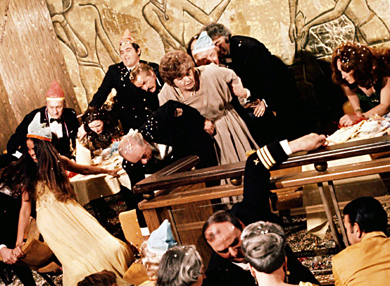 It’s an incredible, strangely beautiful, artfully composed sequence. The passengers, adorned in bright gowns and suits with frills and funny hats, fall to one side, tumbling over chairs and tables and musical equipment. They keep rolling along with the boat as its turned over by the tidal wave – the floor becoming the ceiling. They slide on a surface strewn with colorful New Year’s Eve confetti, trying to grab on to anything, desperately attempting to hang on to loved ones. The tables now have screaming topsy-turvy passengers clinging to them as they hang in the air. It’s insane, wonderfully surreal – Alice in Wonderland going down the rabbit hole by way of Hieronymus Bosch mixed with a Max Ernst collage. The Day of the Locust’s Tod Hackett could paint it in his mind – and go crazy for sure – or maybe Shelley Winters would save him.