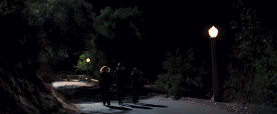 And then, from Jay looking at Sharon, we cut to stuntman Cliff Booth walking his beloved Brandy, his female pit bull, a languorous walk while he’s trying an acid-laced cigarette for the first time. He’s wearing white jeans and white jean jacket, it glows in the night as he strolls Cielo Drive, up in the hills of Los Angeles. It’s a gorgeous shot, man and dog on the road, and we wonder how Cliff will handle that drug trip and then we see … that car. That old busted up loud car passing him – heading in the opposite direction – with Tex Watson, Susan Atkins, Linda Kasabian, and Patricia Krenwinkel chugging up Cielo. The volume of the song hauntingly rising: “Young girls are coming to the canyon. And in the mornings, I can see them walking. I can no longer keep my blinds drawn. And I can’t keep myself from talking.”