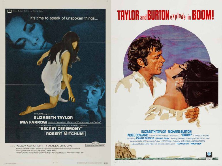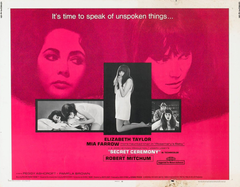 “Late in 1967, while in Rome dubbing ‘Boom!’, Losey was with the Burtons in the Grand Hotel when Elizabeth Taylor remarked (it is said), ‘Why don’t we do something again?’ No more inclined than Winnie the Pooh to remove his head from the honey pot, Losey remembered a script by George Tabori originally written for, and turned down by, Ingrid Bergman. For Losey and his flamboyant designer Richard Macdonald, ‘Secret Ceremony’ was to be the second décor-riot of the ‘time of the Burtons.’ [Producer] John Heyman’s role was to raise the money and assemble the cast: ‘I was the shoehorn,’ he says. Universal put up the cash – several months before ‘Boom!’ hit the rocks.”