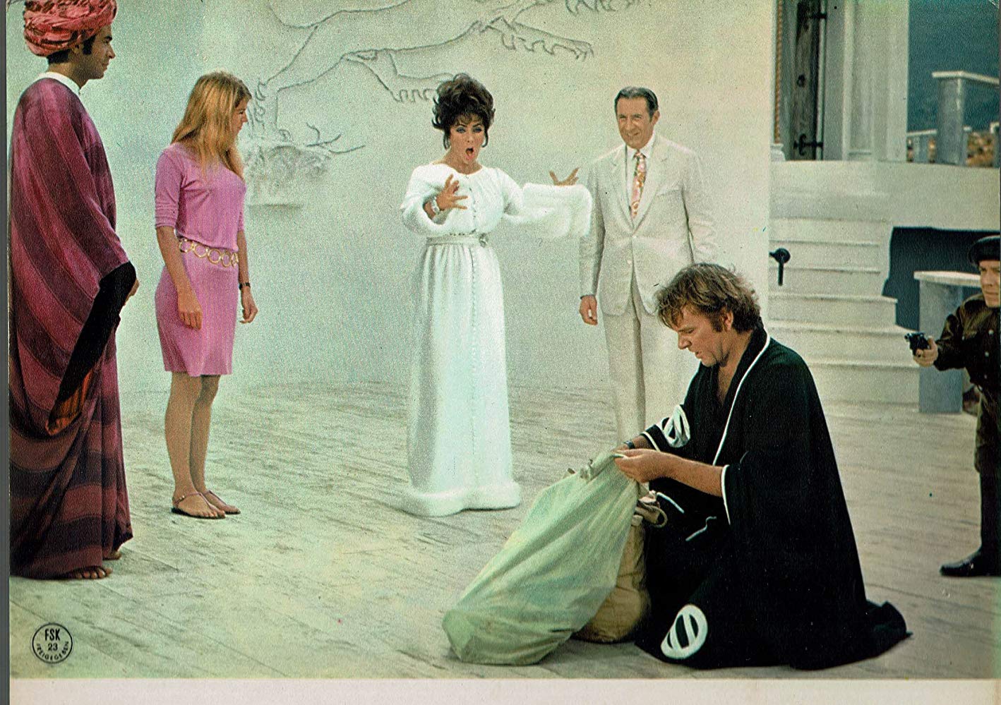 Boom! was, at first, not a movie to star Elizabeth Taylor or Richard Burton. Taylor’s character, Flora “Sissy” Goforth, the millionaire multiple widower ruling over her elaborate, gorgeous, guarded compound on an isolated island in Italy was much older, and dying – around 75-years-old in fact. Taylor was 35-years-old, and though she’s still playing a dying woman, she looked healthy. But what does that mean? Looking healthy? She is so convincing in the movie that she doesn’t sound healthy, so no matter of how she looks. And, Taylor, in real life, had been near death a few times before this. She nearly died of pneumonia during Cleopatra. I also recall a photo of her with Burton – around 1973 – being wheeled in a fur coat (I am not making light of this – the woman was often ill – and likely needed a nice wrap).