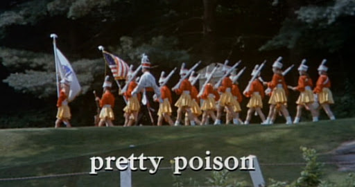 Pretty Poison is also tapping into the gorgeous off-center appeal of Weld, while testing our crush on Thalia from Dobie Gillis. She holds so much more – some kind of secret – a joke or a specific knowledge, maybe arcane knowledge, that only she knew but was keeping it to herself. You just try to find out what it is. (Watch other wonderful, complex Weld performances: Soldier in the Rain, Play It as It Lays, Who’ll Stop the Rain, Looking for Mr. Goodbar, Once Upon a Time in America, Thief, and more) Those mysterious eyes, sometimes placid sometimes excited, her curiosity, vulnerability and strength, and beauty mixed with her intelligence and, in Pretty Poison, fascinating wickedness.