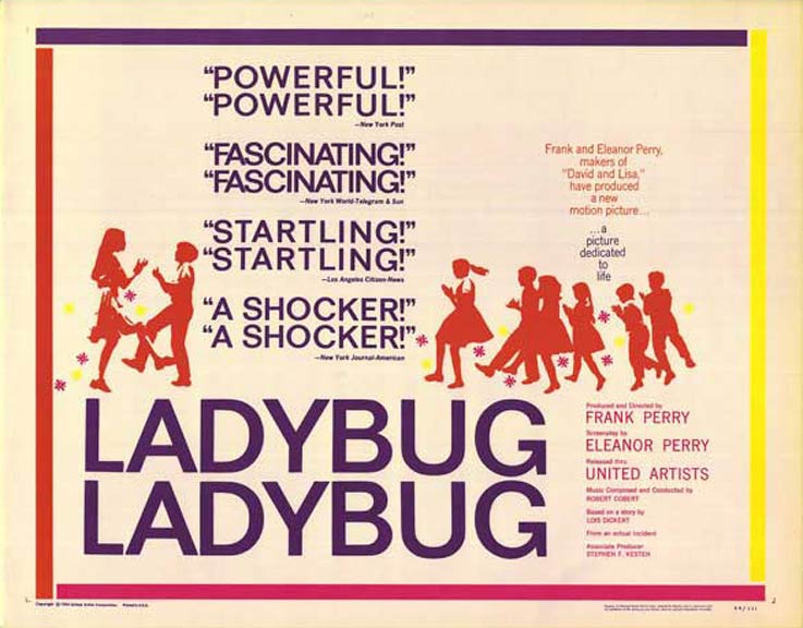 This begins Ladybug Ladybug. A beautiful, haunting, at times terrifying picture, it’s powerful and all-so-human to this day. This was the second film Frank Perry made with Eleanor Perry after David and Lisa. They then took on The Swimmer (starring Burt Lancaster), a transfixing, potently allegorical and disturbing adaptation of John Cheever’s short story. The Swimmer was a stressful production. The direction was taken away from Frank (an uncredited Sydney Pollack shot the rest) but what you see is another expression of the couple’s lyricism and cynicism that, through the early 60s and up until 1970, made them two of the most unique and fascinating independent filmmakers of that time. Among their work, they also made Truman Capote’s Trilogy, and the moving and disturbing Last Summer (I wrote about the film here)– a complex film about troubled, confused young people, and one that takes place on a leisurely beach, but a weirdly empty beach. Grown-up kids from Ladybird Ladybird?