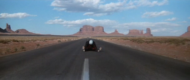 Wintergreen is ambitious but he also seems a little lonely, a little sad, frequently sweet, and at times, perceptive when he sees through bullshit. Knowing how tough the world is out there, he also seems, in moments, a little stupid. And all of this is gonna hurt him in the end. Not just because he’s too nice of a cop, but that seems too obvious a reading for this beautifully made, wonderfully idiosyncratic picture (by one-time director James William Guercio). Instead, he just feels doomed. You look at him riding around the expansive, gorgeous John Ford-Monument Valley and you think… eventually he will fade into this landscape, or he’ll wander the place on his motorcycle, writing up speeding tickets until he’s turned to dust. You feel this before the picture’s unforgettable ending and he feels it – he worries about it. What kind of life is this? How will he leave his mark? As a speck on the landscape hassling motorists, saddled up on two wheels next to his goofy jerk-off partner? He wants to use his brain, to be respected. He also wants to be a big man, he wants to be something like a famous person, he wants to wear the right getup, that big hat, and that fancy suit – he wants to stand out. In the end, he both stands out and fades into the landscape, violently in death – but in a simultaneously ignoble and gorgeous way. Fragility and misunderstanding and cruelty and death in one six-minute reverse tracking shot that’s so moving and so gorgeous, he becomes one with the blacktop and the sky. It’s not the way Wintergreen would want to go, and it is indeed tragic, but it’s one of the most beautiful moments in 1970s cinema – a shot to watch and ponder, your emotions and thoughts moving to mysterious places. Electra Glide in Blue is a picture about the ugliness of human nature, but the beauty of it too, expressively and aesthetically – right down to the glory of Robert Blake’s pint-sized body, zipped up in his motorcycle gear, chomping gun, walking in those boots in the heat, the leather rubbing up against itself – that delicious sound of leather. You can practically hear Lou Reed singing, “shiny, shiny, shiny boots of leather…”